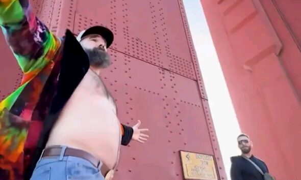 In a photo shared on social media, Kelce could be seen bending over as he peered over his shoulder with a grin on his face ...