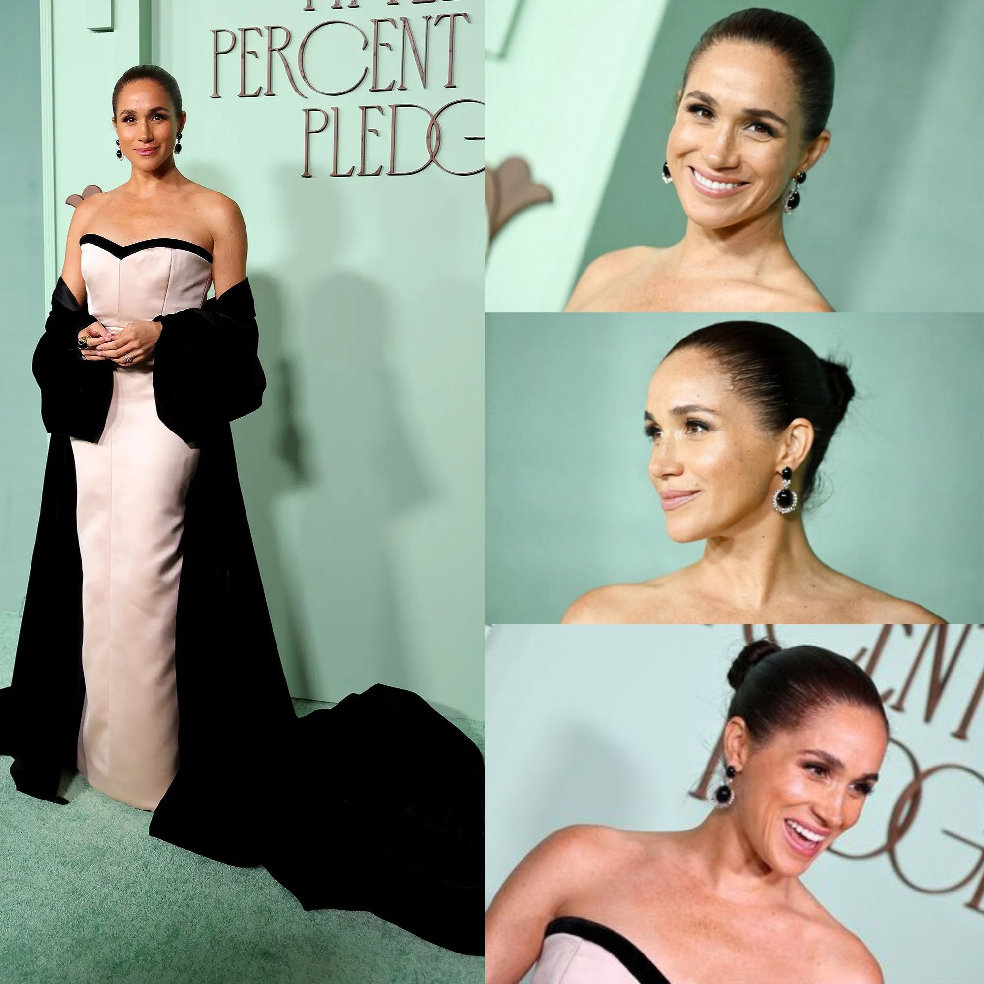 Meghan wore her hair in a sleek chignon and accessorized with black and diamond drop earrings, a large black stone ring and black Stuart Weitzman heels.